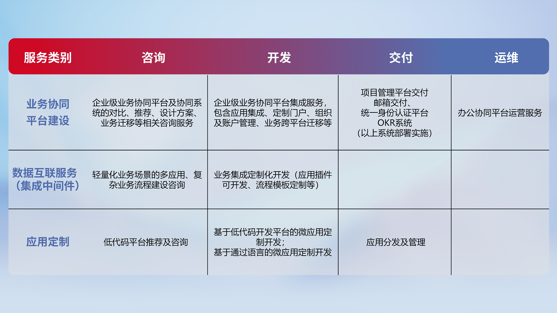 针对钉钉、、、企微、、、IDaas等平台级产品提供产品的规划、、、、方案、、交付、、定制化开发等服务,,,实现如统一协同办公、、、、智能客户服务、、、、混合会议管理、、、智能数据查询、、、、等业务场景,,,,实现数字化转型。。