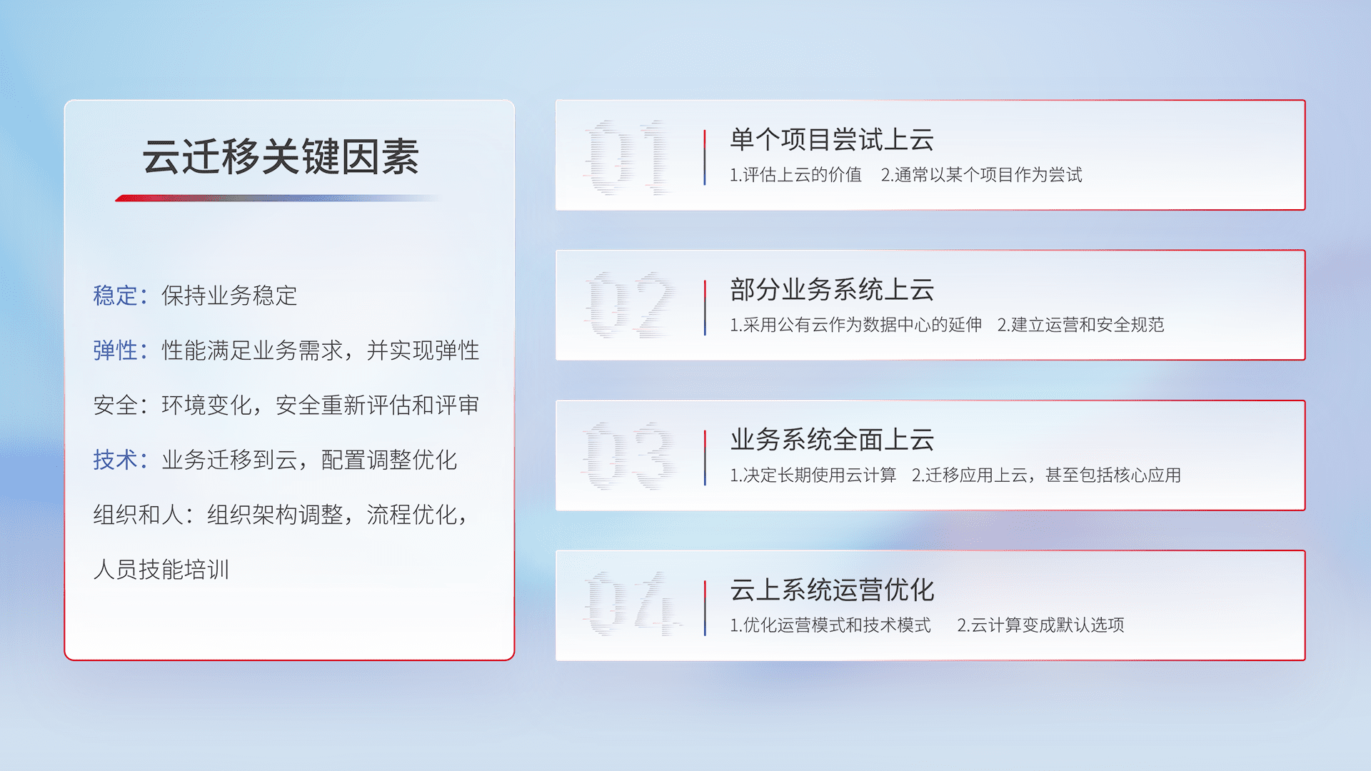 结合实际业务,,,从规划设计、、云平台选型、、云原生改造、、、、数据迁移、、集成交付,,迁移全过程为客户识别最佳上云路径,,,做好风险识别管理,,,,设计网络架构、、、、身份权限、、安全审计合规、、操作审计、、、日志审计、、、、监控告警策略、、、多站点容灾设计等,,,,对云上基础设施进行整体规划,,,,提升IT治理水平,,以满足弹性、、、高可用、、、、高性能的需求。。。