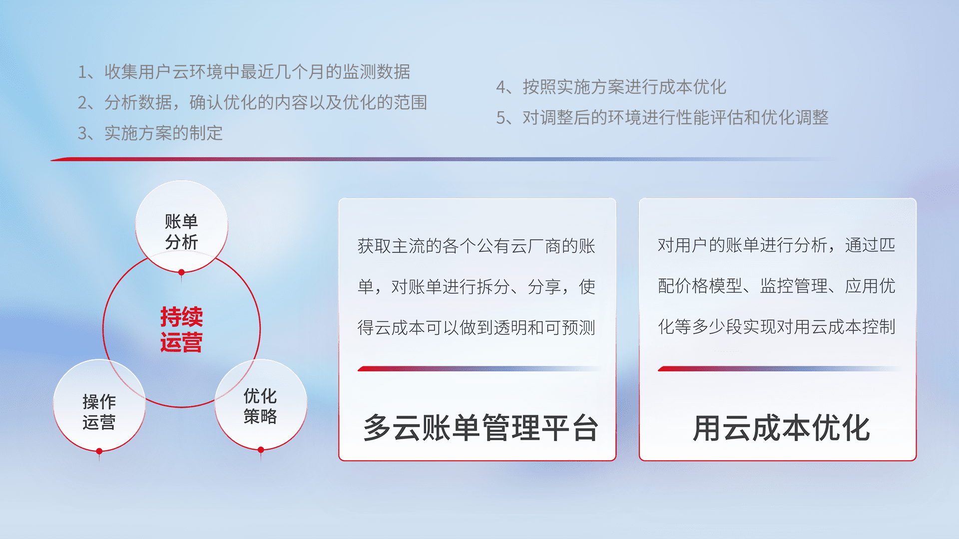 通过多云纳管,,,以统一的资源数据模型把客户的云资源进行抽象和封装,,进而实现对多云资源的统一操作,,,保障云资源管理的可靠性、、、、稳定性与可用性。。量身定制化运维内容,,配置、、开发运维、、、、补丁管理、、、、备份、、、监控、、认证和访问管理、、审计和日常巡检等,,,,保障在用云过程中的可靠度,,,,稳定度以及高可用率。。